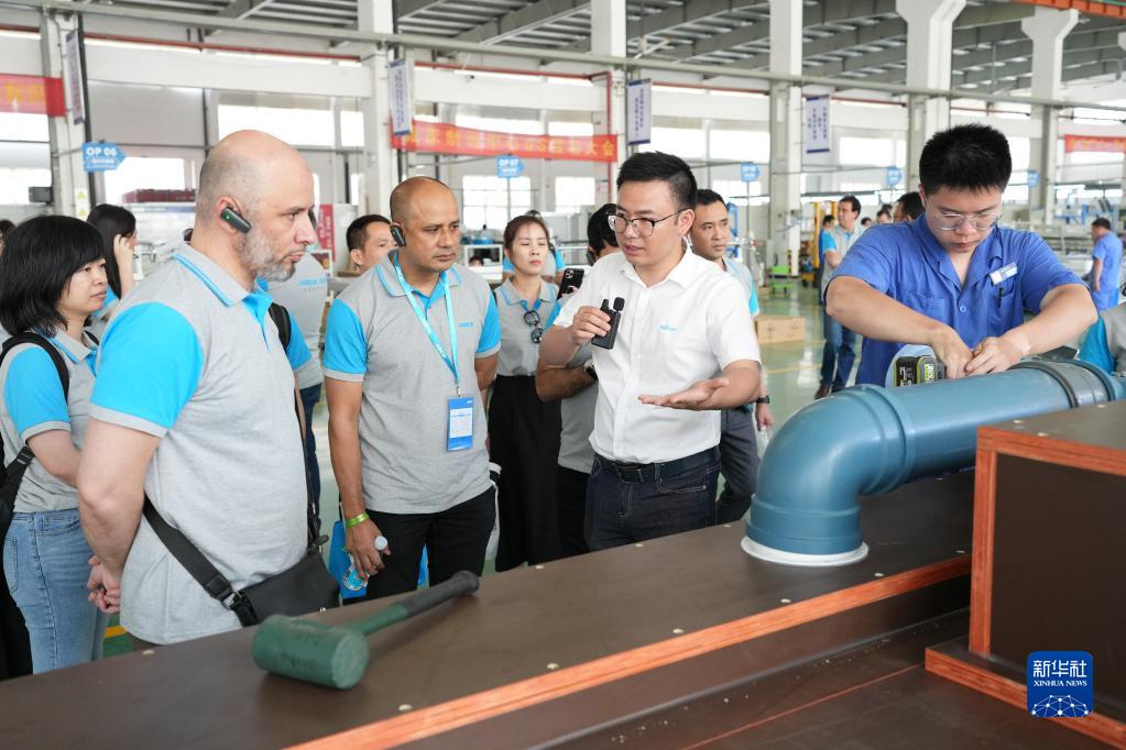 5月18日,在臨海拓卡奔馬機電科技有限公司,海外戰略經銷商代表在參觀裁床生產線。