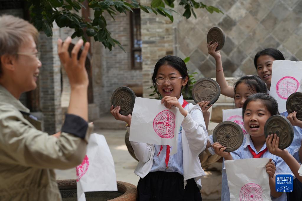 5月18日,小學生在河北省石家莊市新華區一家清代建筑博物館體驗瓦當拓片。