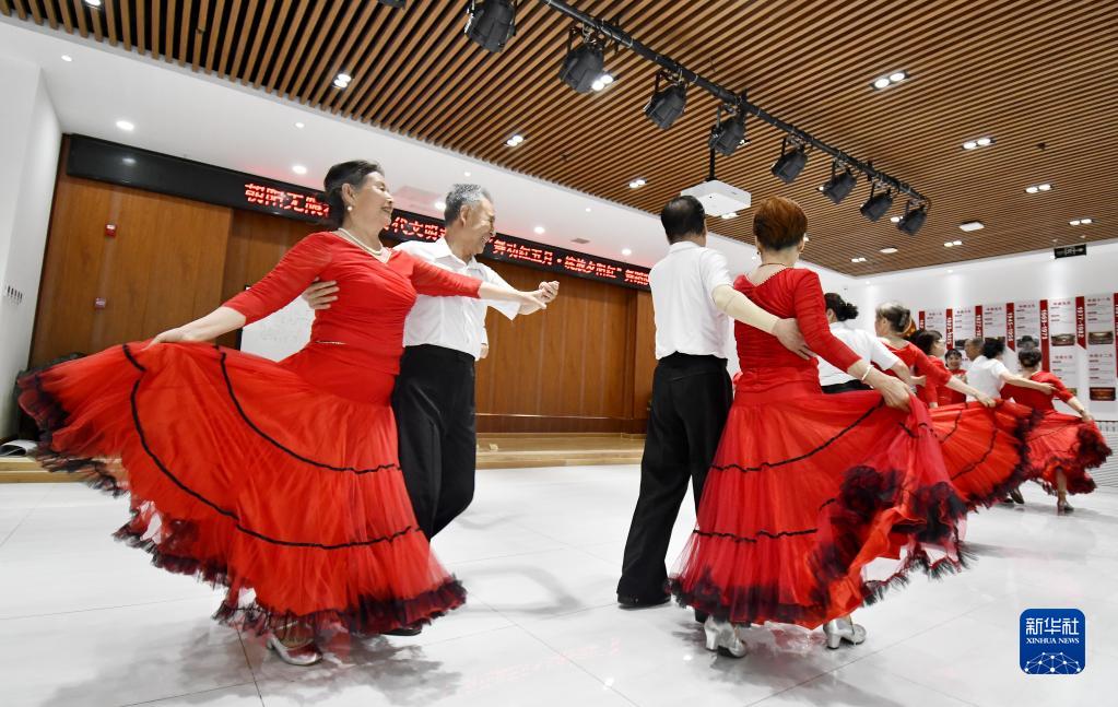 朝陽無限社區的老年人舞蹈隊在社區黨群活動中心排練舞蹈(5月17日攝)。