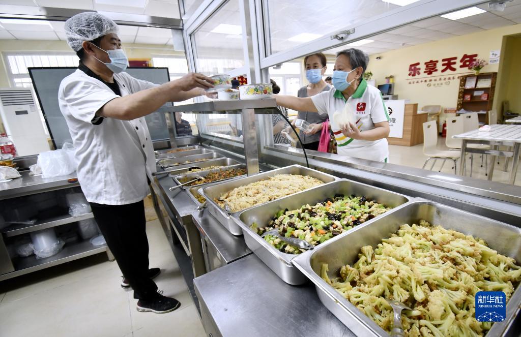 老人在十里堡社區的老年餐廳選購午餐(5月17日攝)。