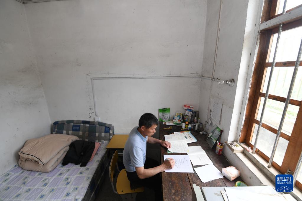 5月18日,在廣西靈川縣蘭田瑤族鄉深潭教學點,趙洪老師在學校辦公室兼臥室里備課。