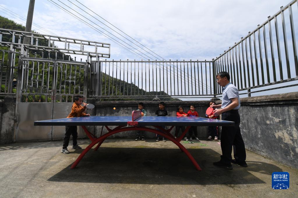 5月18日,在廣西靈川縣蘭田瑤族鄉深潭教學點,趙洪老師和學生打乒乓球。