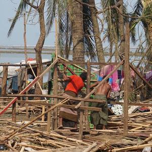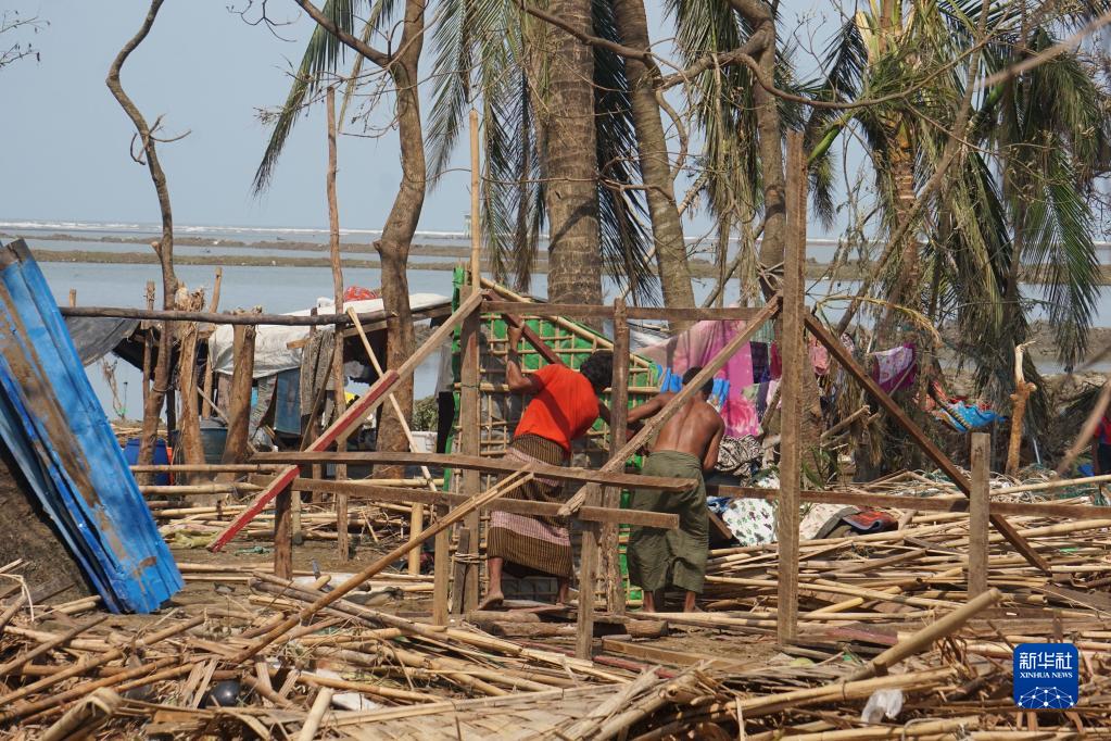 5月17日,在緬甸實兌,村民在熱帶氣旋“穆查”造成的廢墟上重建房屋。