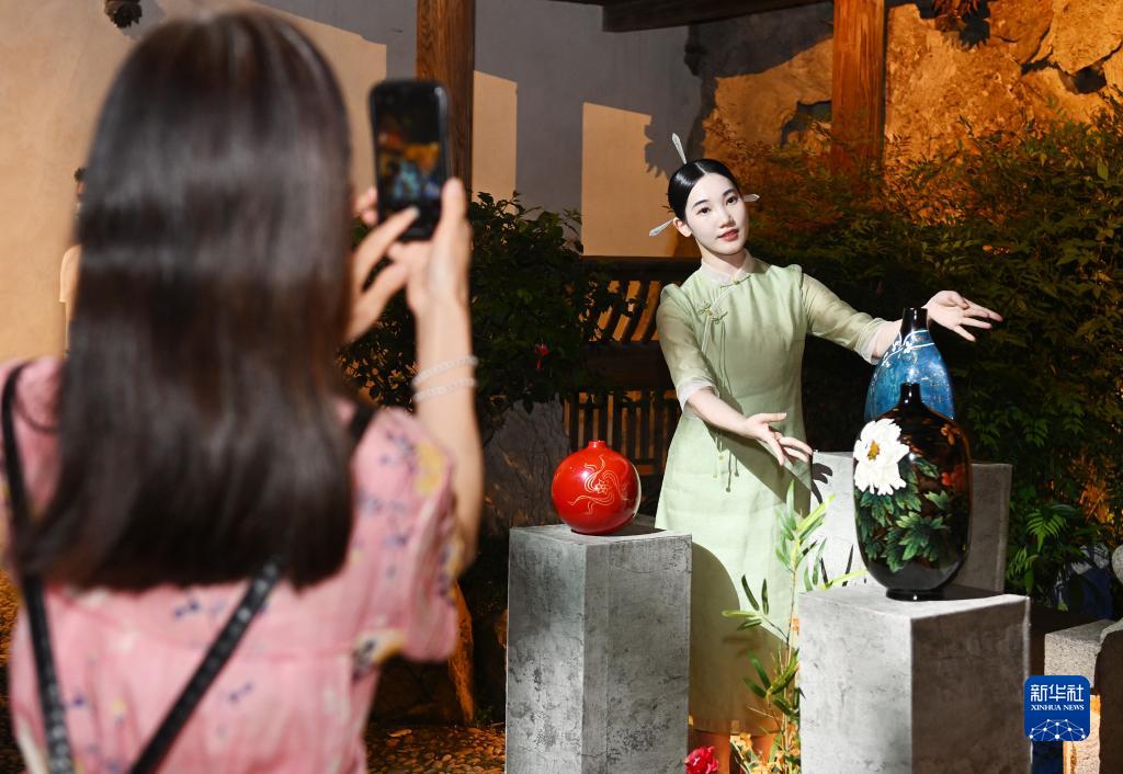 5月18日,觀眾在福州市三坊七巷歷史文化街區參觀拍攝傳統漆器工藝品的沉浸式實景展示。新華社記者 李賀 攝