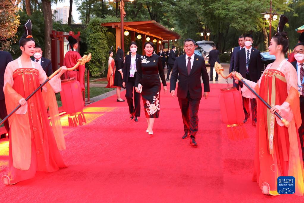 5月18日晚,出席中國-中亞峰會的中亞國家元首夫婦陸續抵達陜西省西安市大唐芙蓉園,參加在這里舉行的歡迎儀式。這是吉爾吉斯斯坦總統扎帕羅夫和夫人扎帕羅娃抵達。新華社記者 徐子鑒 攝