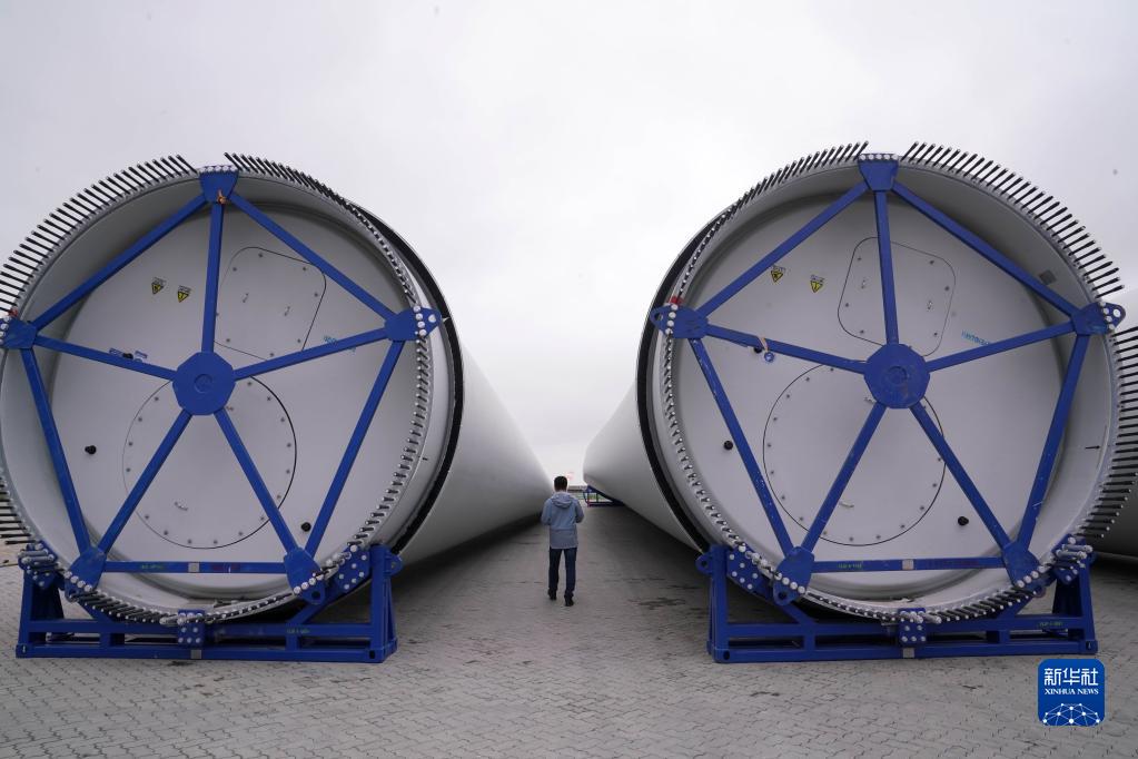 5月18日在江蘇如東小洋口風電母港拍攝的風電設施組件。