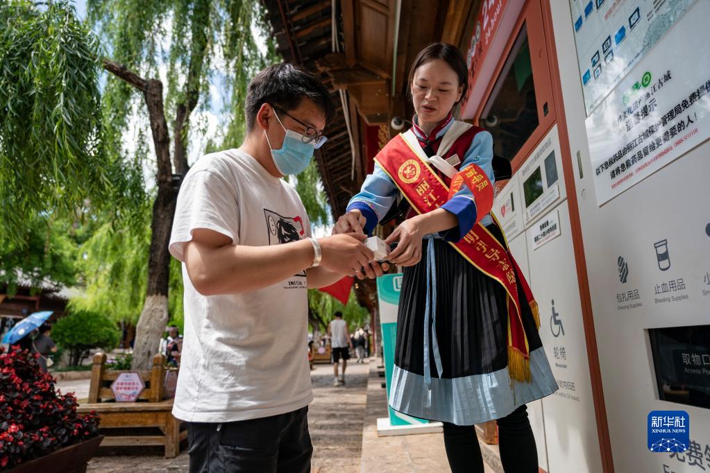 5月18日,一名志愿者(右)在麗江古城幫助游客通過24小時智能急救站領取小傷口處理用品。