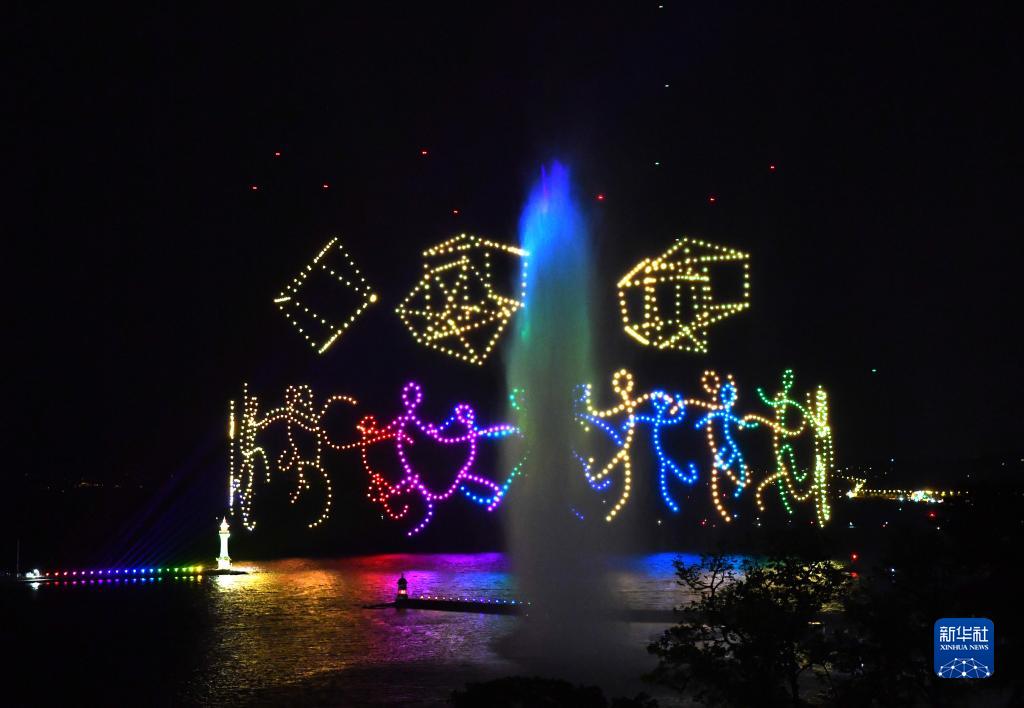 當晚,無人機光影音樂秀在瑞士日內瓦湖上舉行,超過1350架無人機點亮夜空,吸引市民駐足觀看。