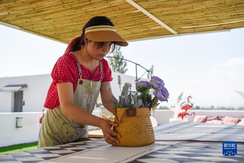 新疆伊犁哈薩克自治州霍城縣蘆草溝鎮四宮村一家民宿的工作人員在用花布置就餐區(5月17日攝)。