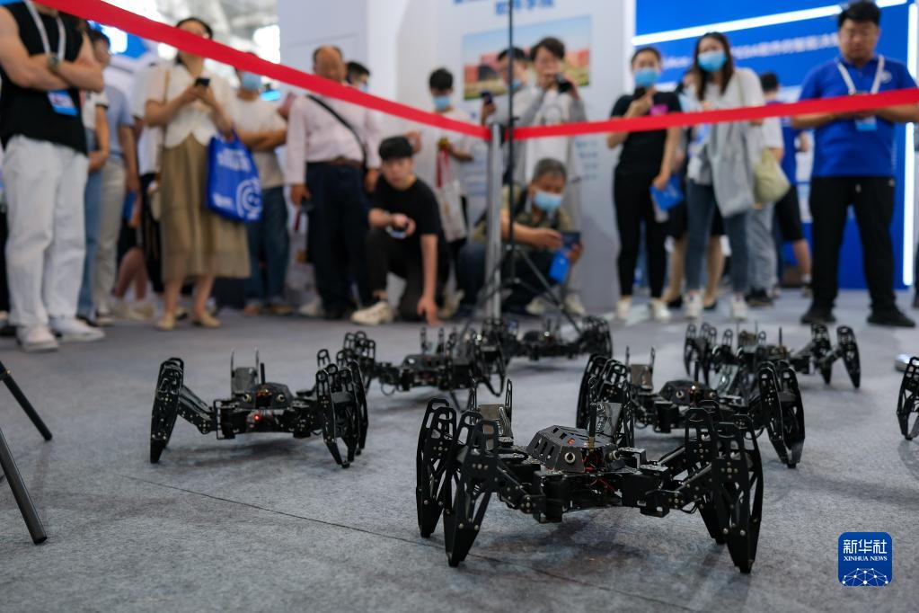 5月18日,觀眾在第七屆世界智能大會智能科技展上觀看機器人編隊舞蹈。