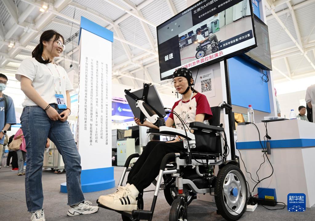 5月19日,觀眾在第七屆世界智能大會智能科技展上體驗智能腦控輪椅。