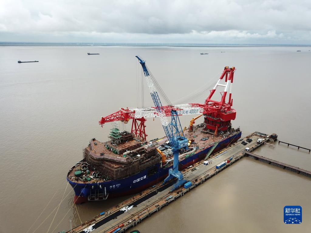 5月19日在江蘇省南通市啟東海工船舶工業園拍攝的,上海振華重工啟東海洋工程股份有限公司正在建設中的4000噸全回轉起重船(右)(無人機照片)。