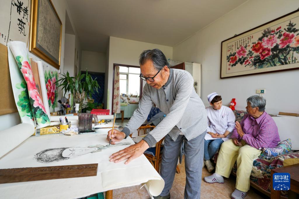 5月19日,居住在河北省灤南縣一家養老機構的老人在練習繪畫。