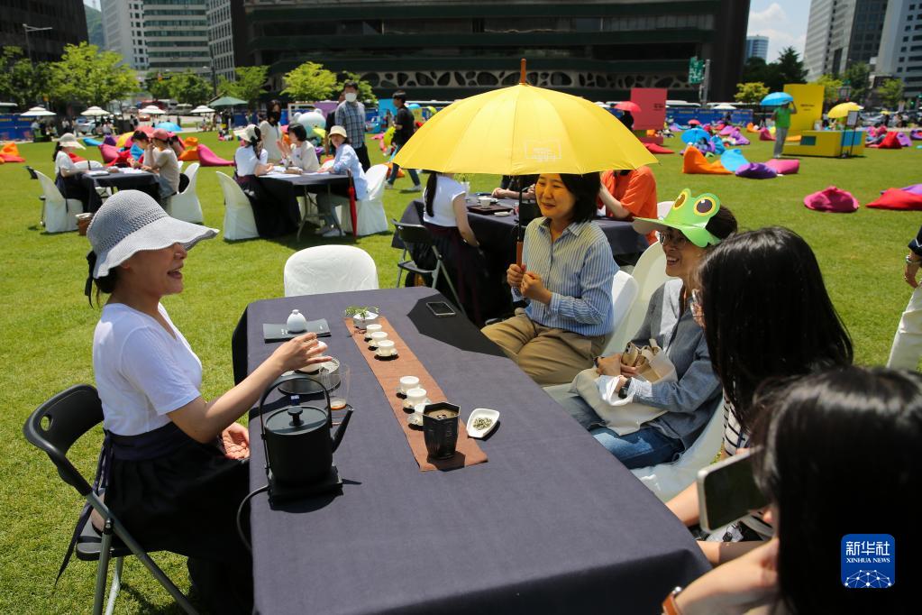 5月19日,人們在韓國首爾廣場品嘗中國茶。