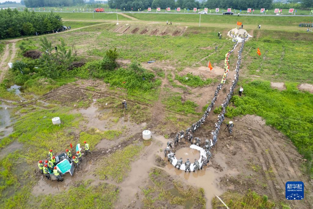 5月19日,在洞庭湖區防汛搶險應急救援演練中,參演人員演練處置管涌險情(無人機照片)。