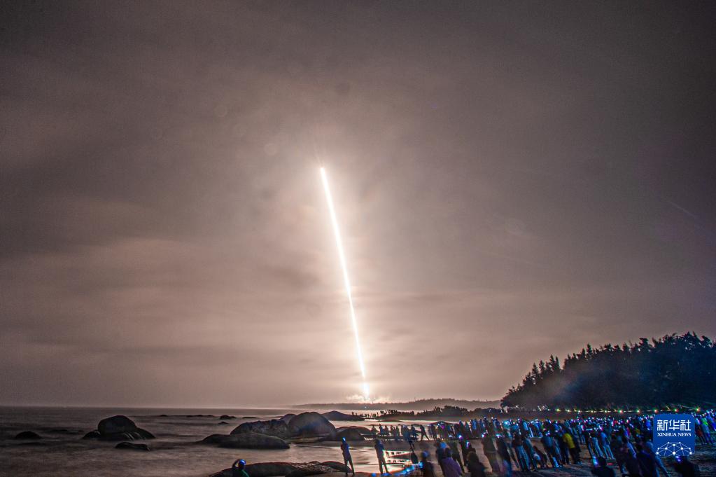大批觀眾在海南省文昌市淇水灣觀看、拍攝火箭發射(2021年3月12日攝)。