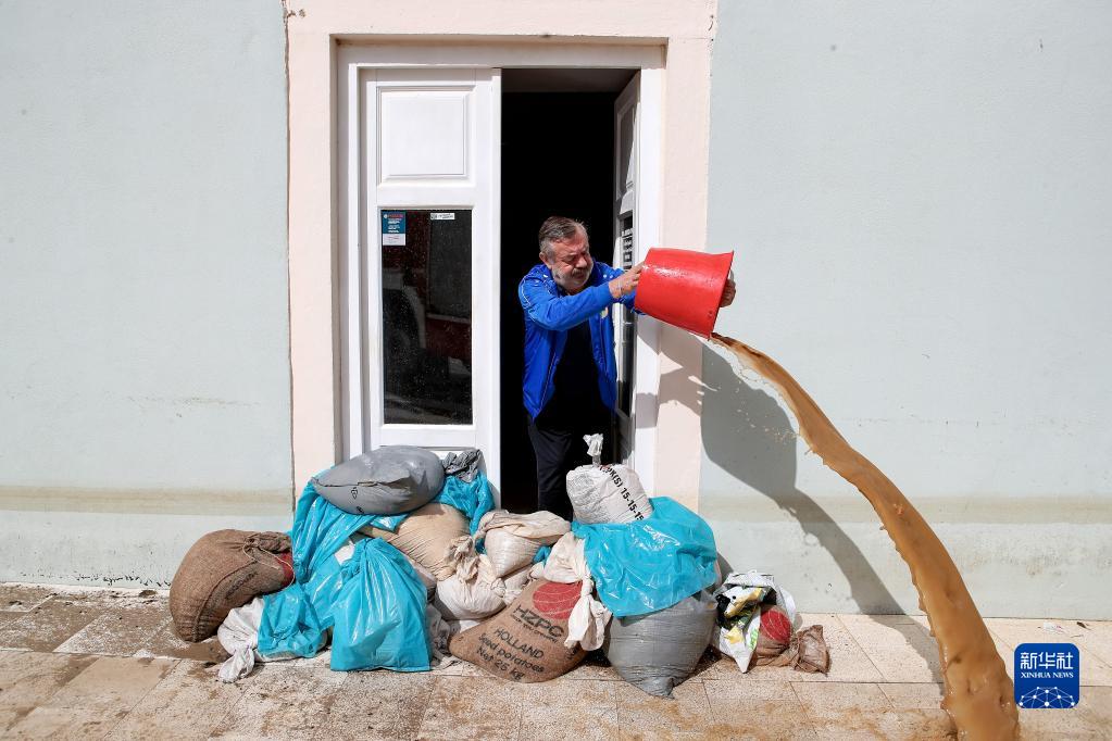 5月16日,在克羅地亞奧布羅瓦茨,一名男子清理進水的房屋。