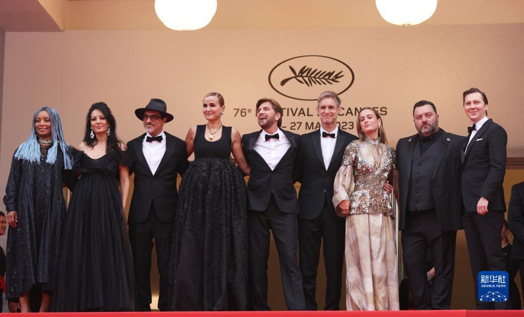 5月16日,在法國戛納舉行的第76屆戛納國際電影節上,主競賽單元評審團主席、瑞典導演魯本·奧斯特倫德(中)攜眾評委亮相開幕式紅毯。