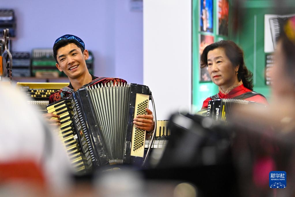 在伊寧市六星街,多民族手風琴樂隊在為游客演出(5月19日攝)。