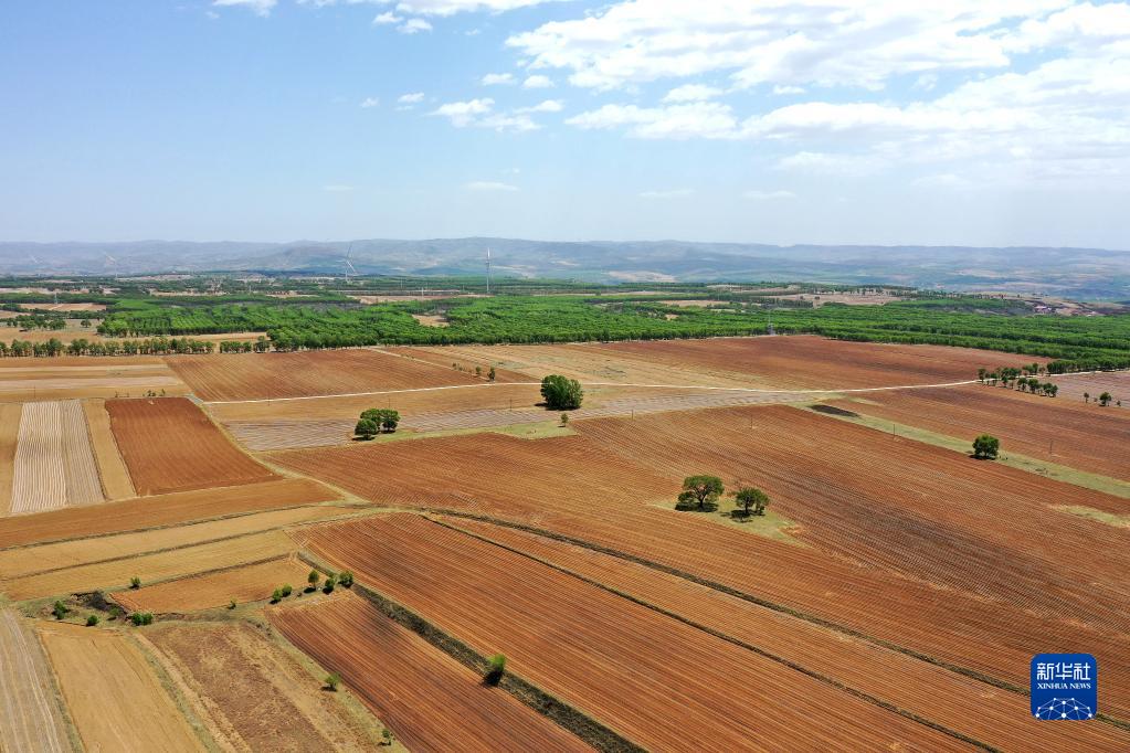 山西省右玉縣四臺溝村田園景色(5月18日攝,無人機照片)。