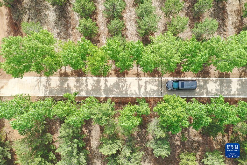 車輛在山西省右玉縣新城鎮道路上行駛(5月19日攝,無人機照片)。