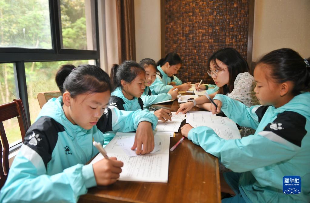 在海南瓊中縣舉辦的中國足協女足青訓中心“希望杯”U12組比賽的空閑時段,來自涼山彝族自治州的四川隊隊員舍布么扯鳩莫(左二)和隊友們在老師帶領下學習文化課(4月10日攝)。