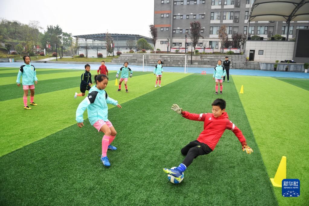 在瀘州天立春雨學校足球場,來自涼山彝族自治州的舍布么扯鳩莫(前左)與男隊一起訓練(3月29日攝)。