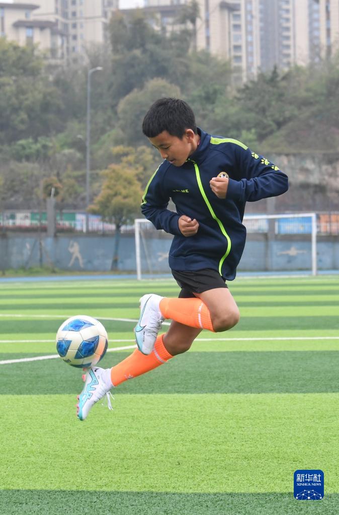 在瀘州天立春雨學校足球場,來自涼山彝族自治州的楊坤在進行訓練(3月29日攝)。