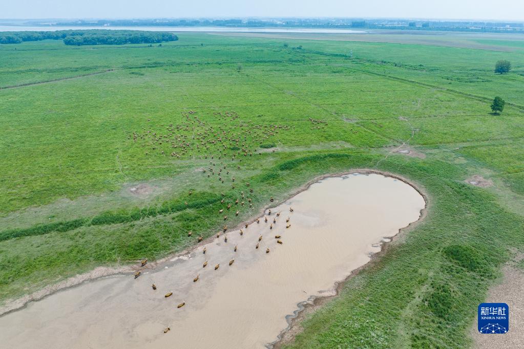 5月19日,一群麋鹿在湖北石首麋鹿國家級自然保護區內活動(無人機照片)。
