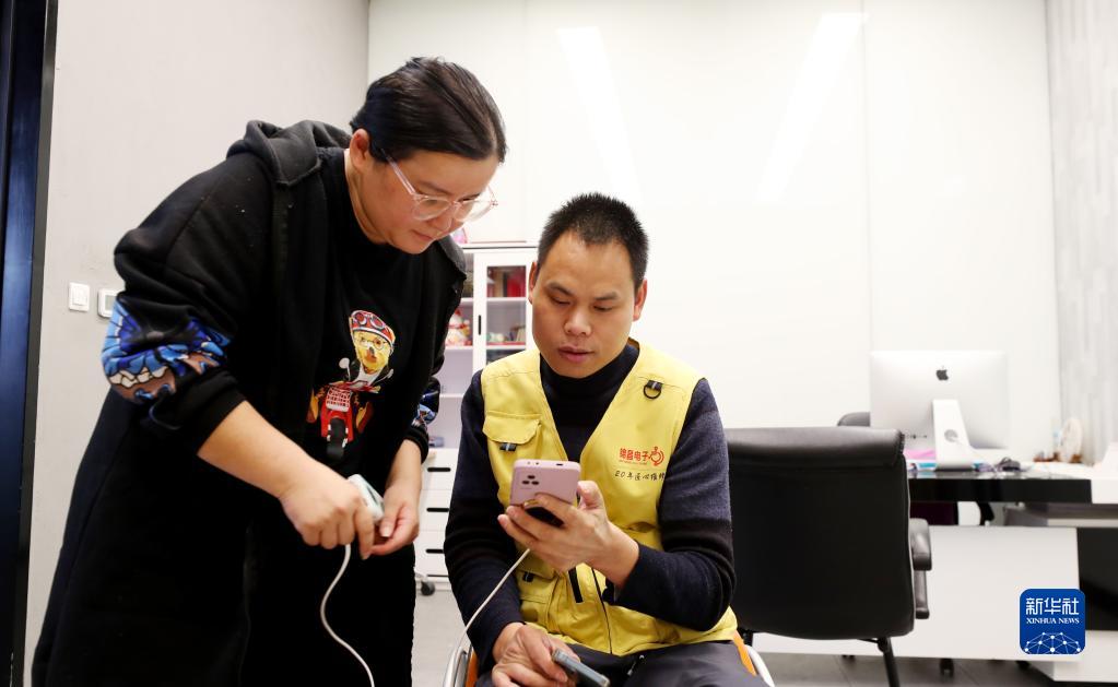 劉瑩在創業導師柯水昌(右)的辦公室內用手機打字的方式跟他交流討論(4月14日攝)。