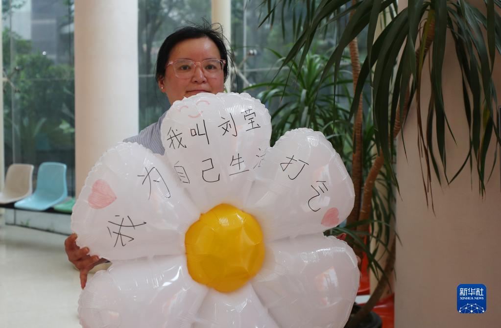 在上海虹口區青少年活動中心,劉瑩完成了一場活動的氣球拱門搭建工作后,在一個花形氣球上寫下了自己想說的話(5月18日攝)。