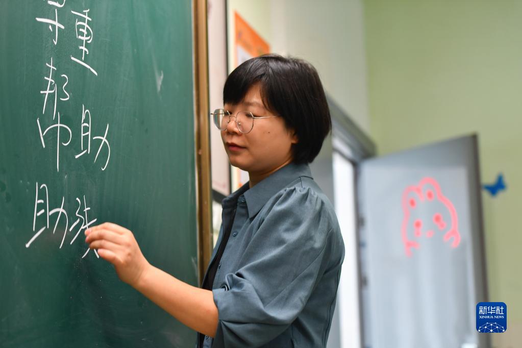在湘潭市雨湖區風車坪學校,扶婷向五年級學生分享她的助殘故事時在黑板上寫下助殘關鍵詞(5月19日攝)。