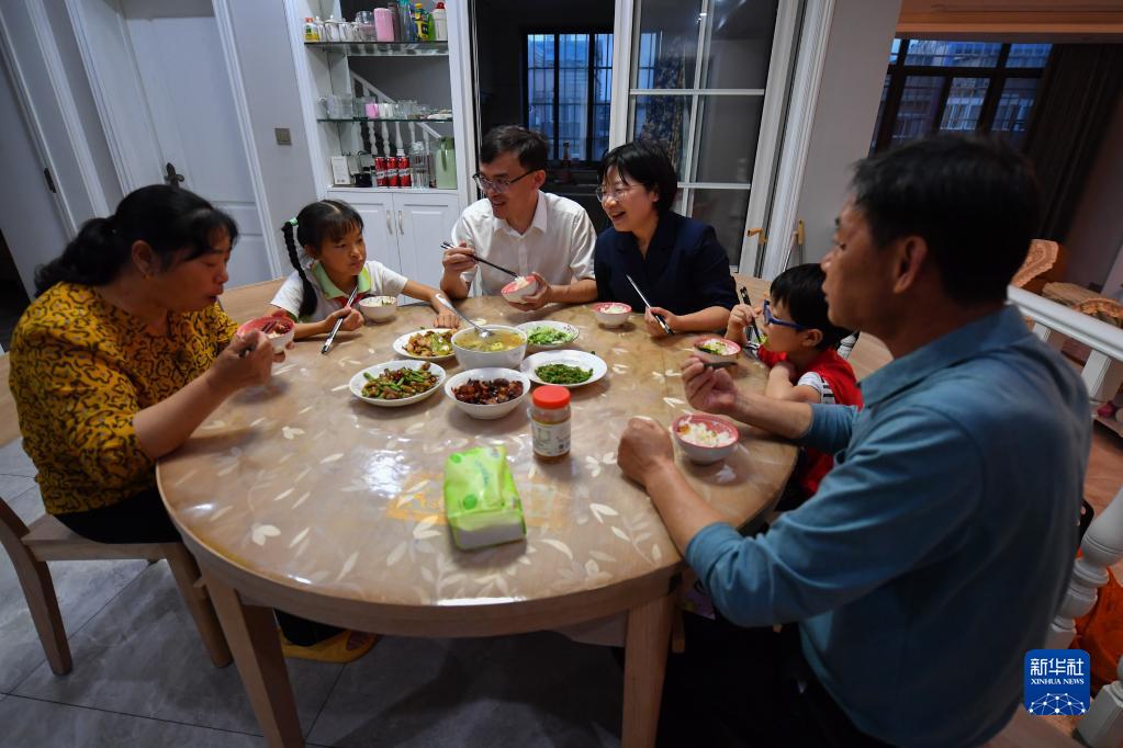 扶婷在湘潭市雨湖區的家中與家人一起吃晚飯(5月18日攝)。