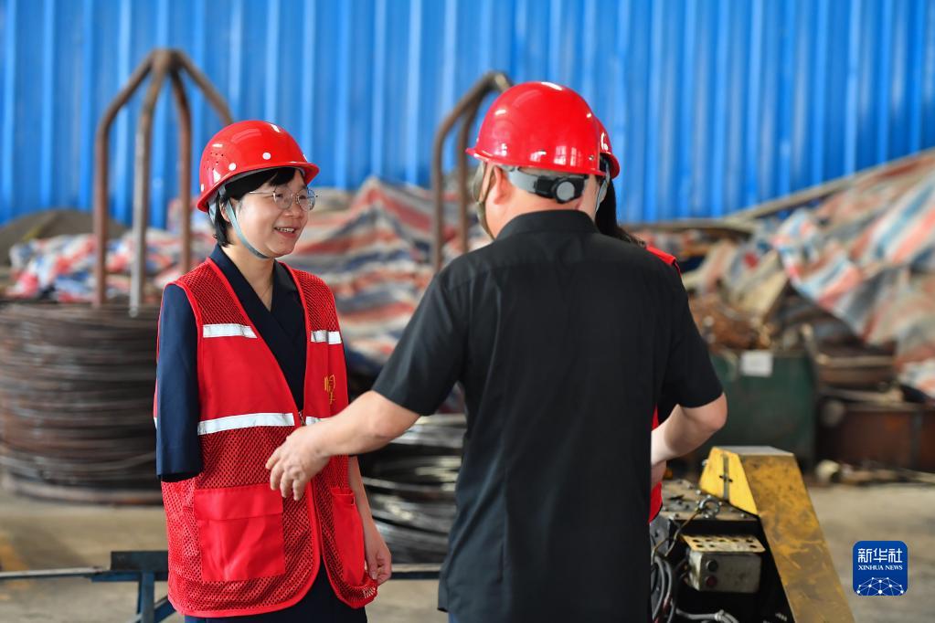 在湘潭市岳塘區一個殘疾人集中就業示范基地,扶婷(左)和法律志愿服務團成員為企業提供免費法律咨詢服務(5月18日攝)。