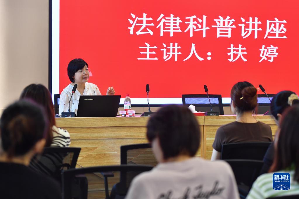在湘潭市雨湖區廣場街道和平社區,扶婷為居民開展法律科普講座(5月19日攝)。