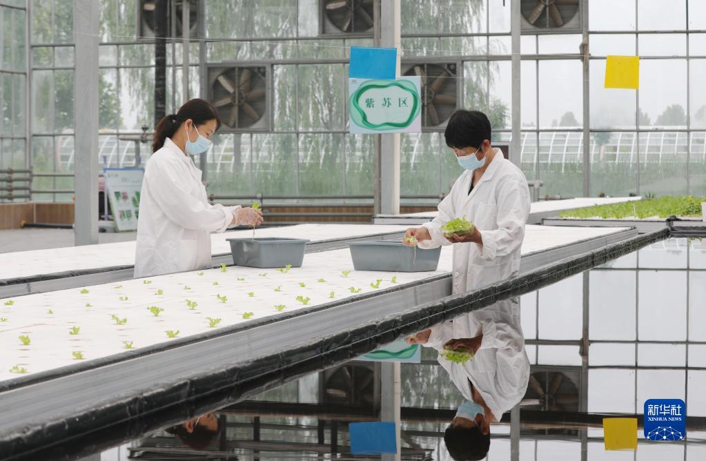 5月20日,河北省保定市徐水區一家現代農業示范園區的工作人員在智能溫室內定植水培蔬菜幼苗。