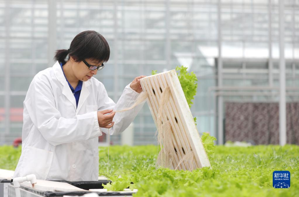 5月20日,河北省保定市徐水區一家現代農業示范園區的工作人員在智能溫室內查看水培蔬菜生長情況。