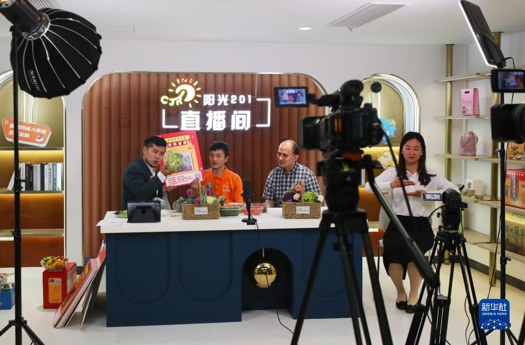 5月20日,來自崇明區的一家殘疾人蔬果種植合作社的工作人員(左二),在“陽光201”平臺直播間內進行配備手語翻譯的無障礙直播銷售。