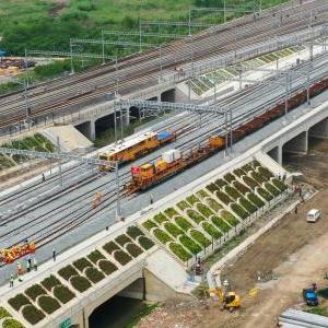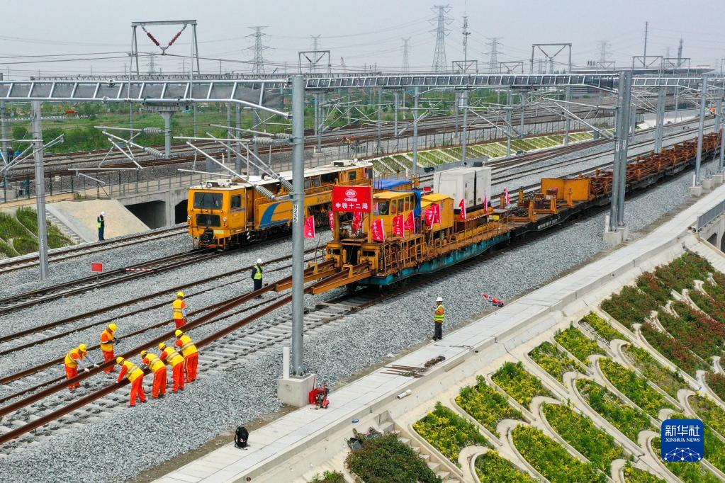5月20日,在滬寧沿江高鐵太倉站施工現場,中鐵十二局的工程人員利用機械將鋼軌放入承軌槽(無人機照片)。