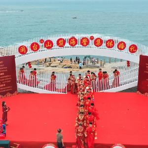 當日,一場以“愛情恒久遠、幸福長相伴”為主題的閩臺“山盟海誓”集體婚禮暨2023年閩臺婚姻家庭交流活動在福建省福州市平潭縣舉辦。21對閩臺新人身穿紅色中式婚服,手牽紅繡球,行跨火盆、踩瓦片、扎繡球和“合茶”、“合巹”、“海誓”等閩臺傳統結婚禮儀,結下跨越海峽的姻緣。