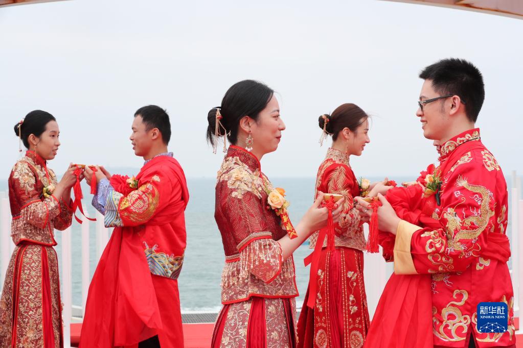當日,一場以“愛情恒久遠、幸福長相伴”為主題的閩臺“山盟海誓”集體婚禮暨2023年閩臺婚姻家庭交流活動在福建省福州市平潭縣舉辦。21對閩臺新人身穿紅色中式婚服,手牽紅繡球,行跨火盆、踩瓦片、扎繡球和“合茶”、“合巹”、“海誓”等閩臺傳統結婚禮儀,結下跨越海峽的姻緣。