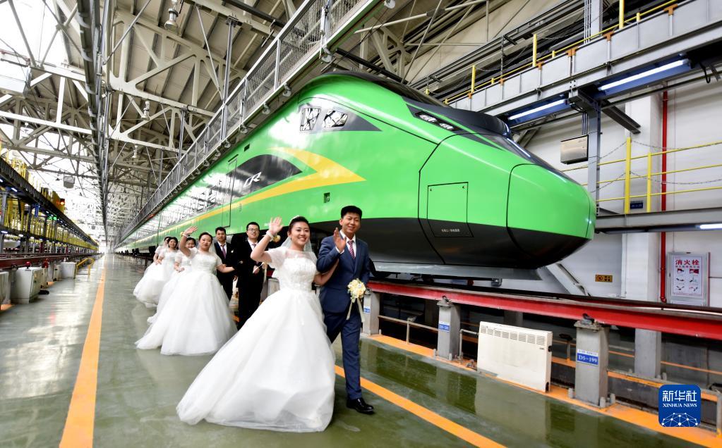 5月20日,新人們以休整中的動車組列車為背景拍攝婚紗照。