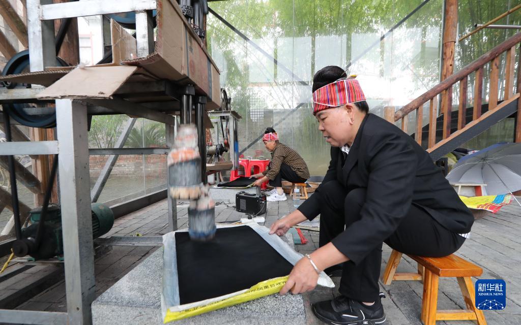 5月20日,工人在貴州省黔東南苗族侗族自治州施秉縣桃子灣工業園區一家服飾生產企業加工布料。