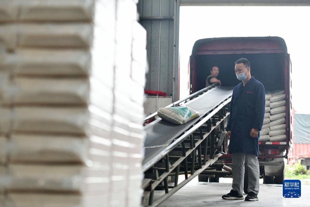 5月20日,工人在貴州省黔東南苗族侗族自治州施秉縣桃子灣工業園區一家大米加工企業運輸大米。