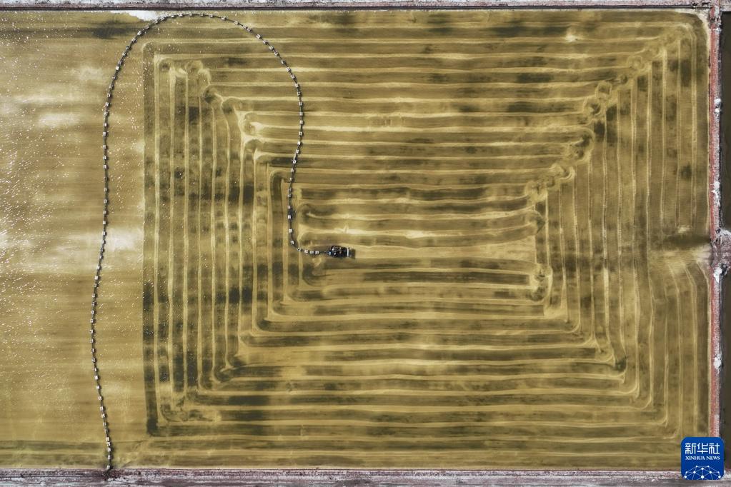 5月14日,唐山市曹妃甸區南堡鹽場的工人在鹽田內使用機械設備收獲春鹽(無人機照片)。