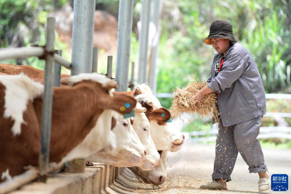 5月18日,工人在貴州省黔東南苗族侗族自治州黃平縣新州鎮黃飄村給自家飼養的牛投飼料。