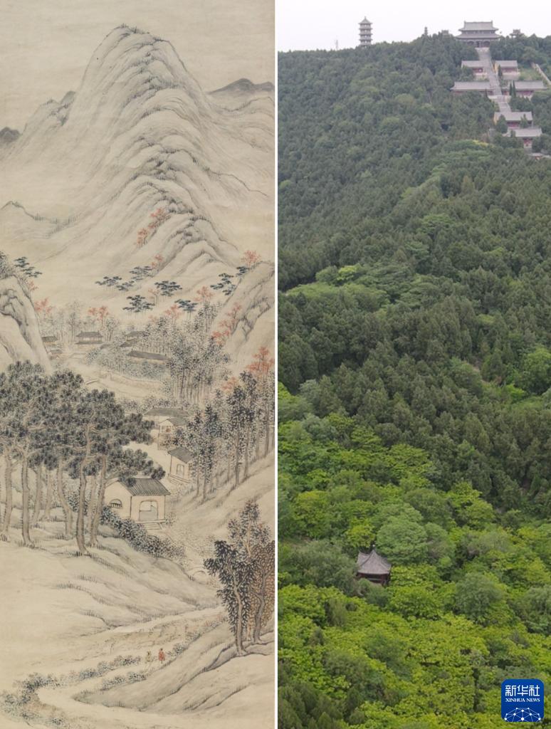 這是一張拼版照片,左圖為:《八公秋霽圖》,由清代畫家潘思牧創作,現收藏于安徽博物院(新華社發,李鵬飛 攝);右圖為:5月16日拍攝的位于安徽省淮南市壽縣的八公山風景區(無人機照片,新華社記者張端攝)。