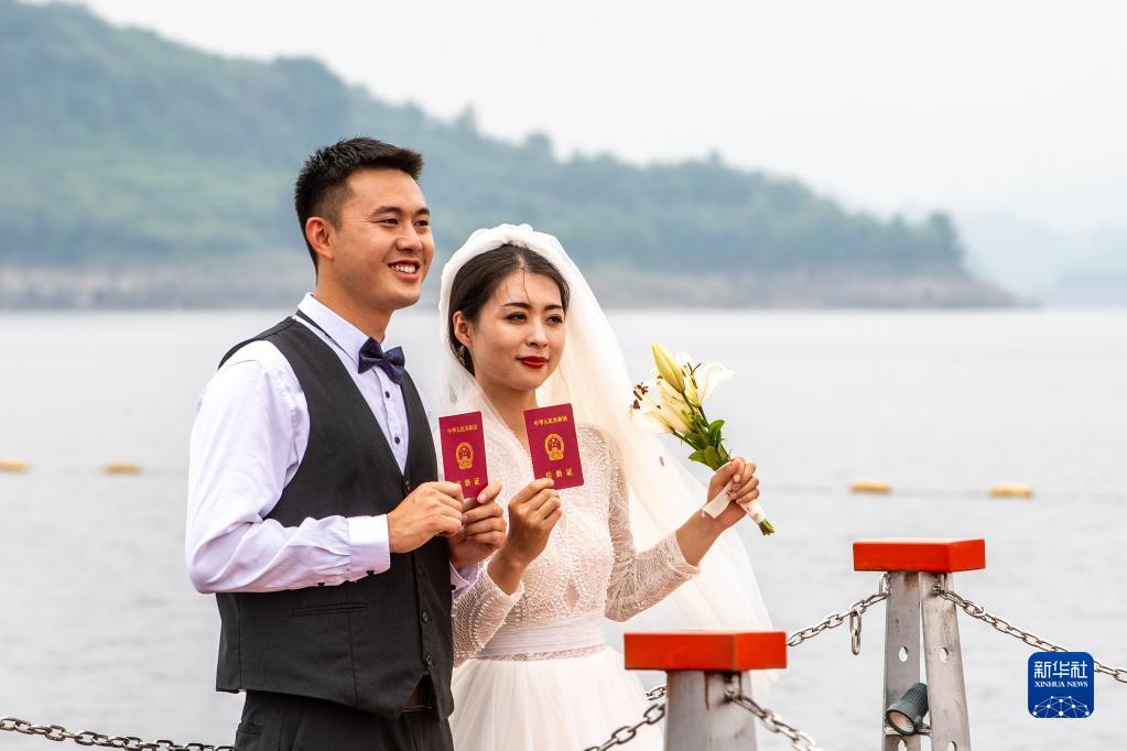 5月20日,新人在重慶市長壽湖風景區舉辦婚禮。新華社記者 唐奕 攝