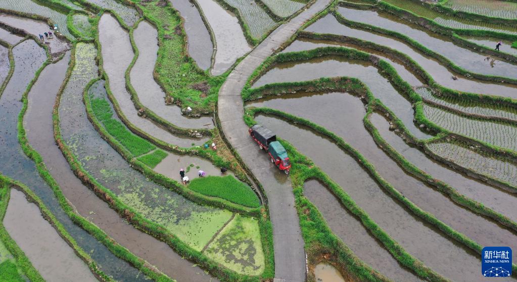 5月20日,在貴州省黔東南苗族侗族自治州從江縣剛邊壯族鄉高麻村,農民在梯田里勞作(無人機照片)。