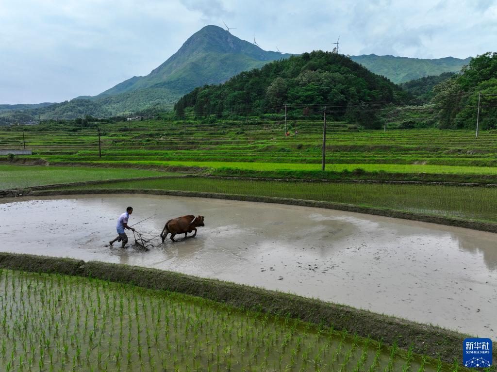 5月20日,湖南省常寧市廟前鎮泉井村農民在農田里勞作(無人機照片)。